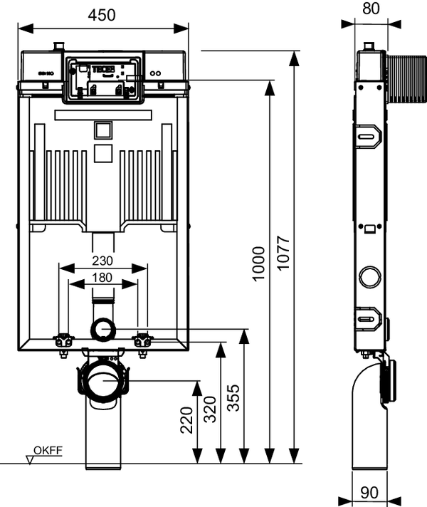 Cassetta Octa II con installazione placca di comando con sistema “easy fit” per WC a parete, profondità 8 cm; per l’installazione dentro o di fronte a una parete solida.