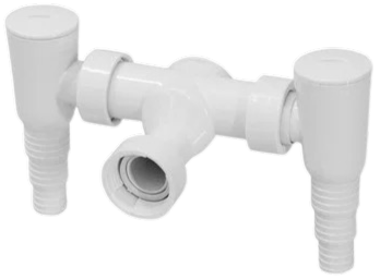 Doppio attacco per due macchine lavatrici, con dispositivo antiriflusso per impedire che lo scarico di una macchina finisca nella tubolazione della seconda. Colore bianco; attacco alla curva tecnica 1", diametro 25/22/19.
